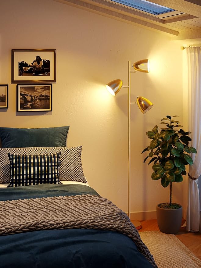 addlon Tree Floor Lamp with 3 Adjustable Rotating Lights and Matching LED Bulbs, Standing Tall Pole Lamps for Living Room, Bedroom, Home, Office - Brass Gold