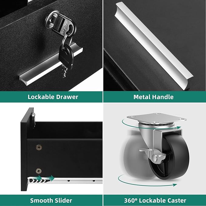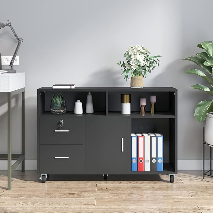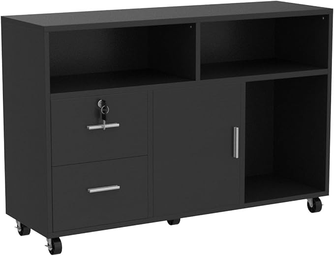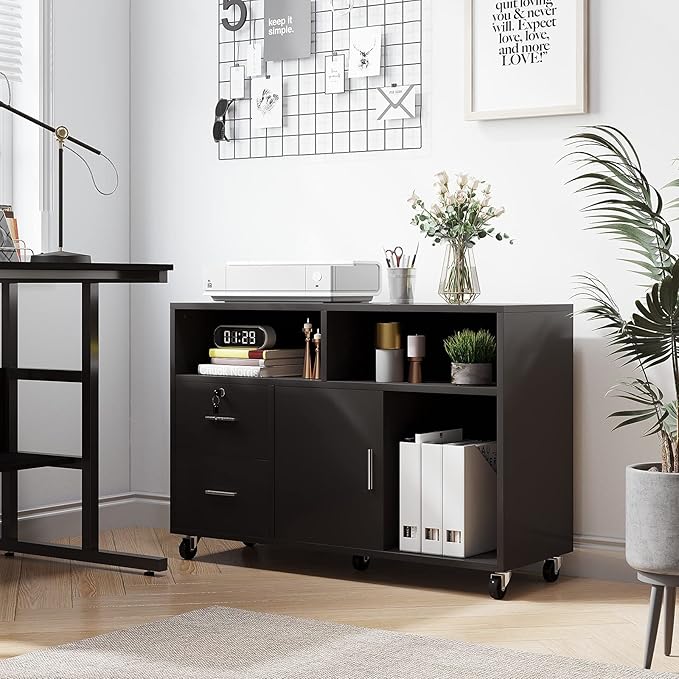 YITAHOME Wood File Cabinet, 2 Drawer Mobile Lateral Storage Cabinet Printer Stand with Lock and Open Storage Shelves for Home Office, Black,Drawers without Hanging Bars