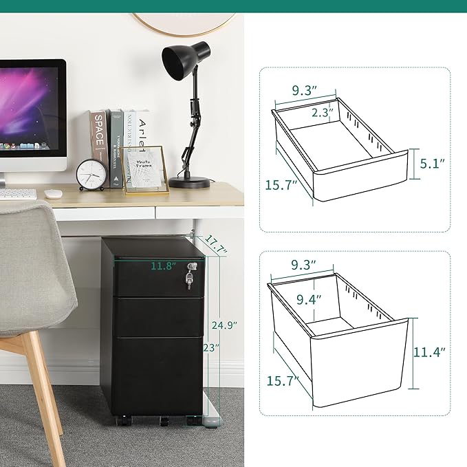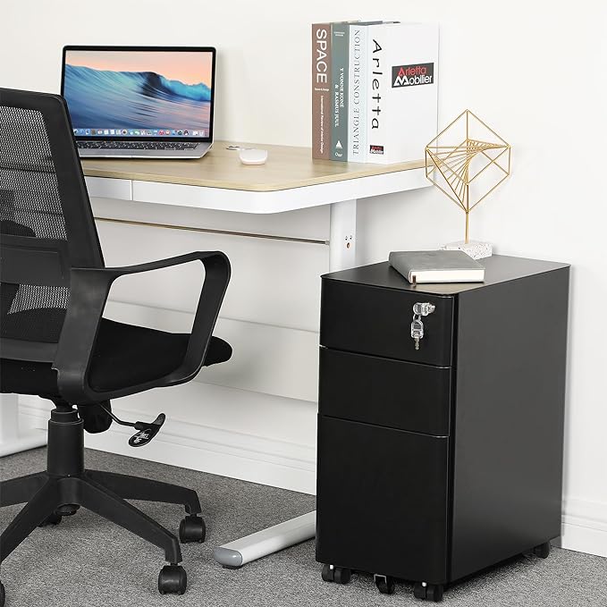 YITAHOME 3-Drawer Metal Filing Cabinet Office, Compact Portable Slim File Cabinet Drawers with Keys, Pre-Built Office Storage Cabinet for A4/Letter/Legal (Black)