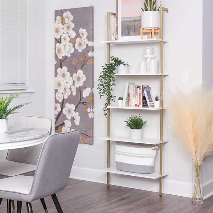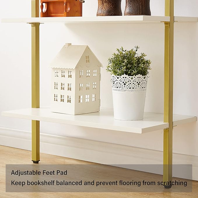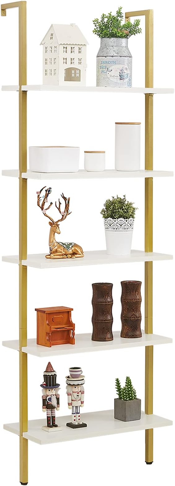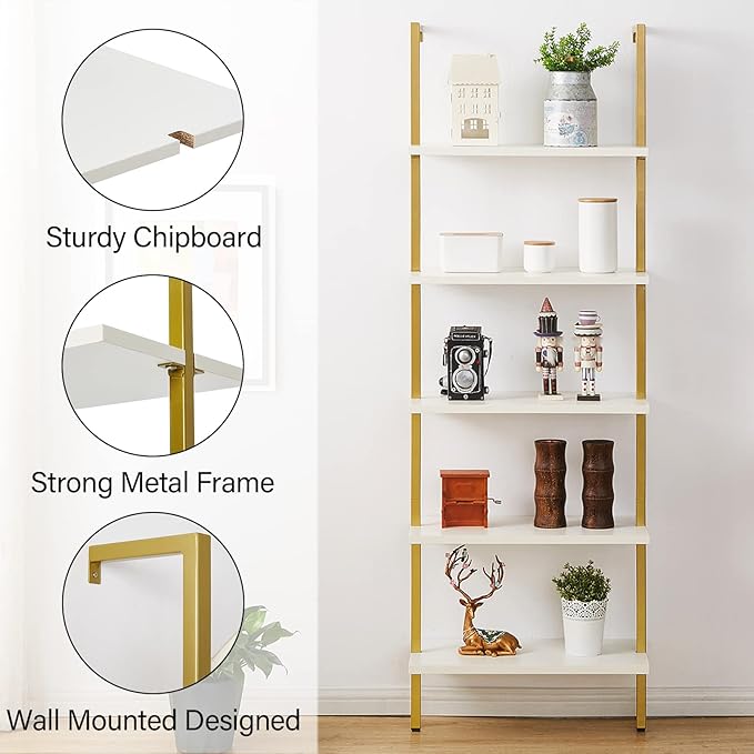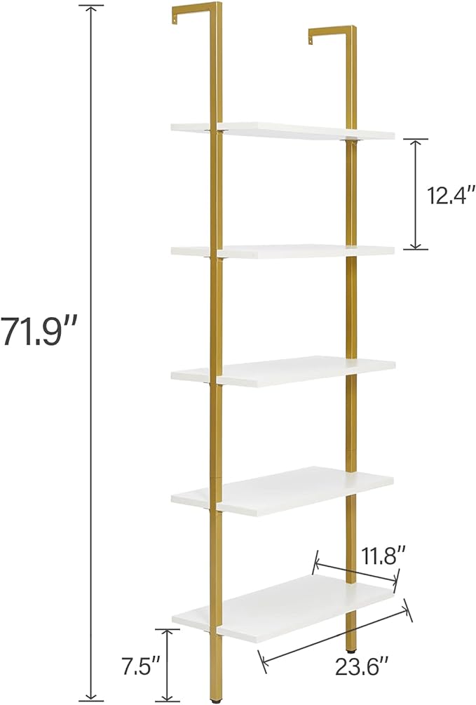 SUPERJARE Modern Ladder Shelf, 5-Tier Open Wall-Mounted Bookshelf with Stable Metal Frame, 72 Inches Storage Rack Shelves, Stand Bookcase for Home Office - White/Gold