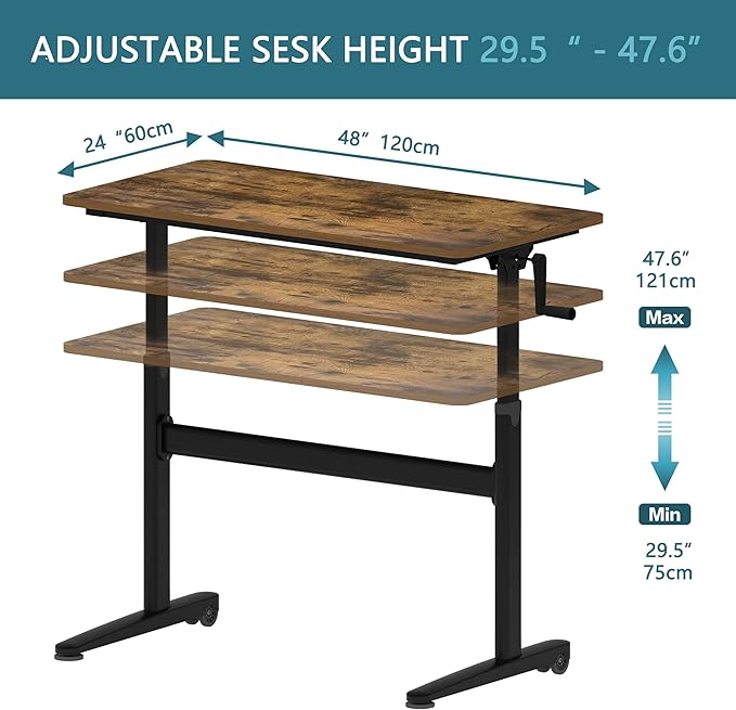 Manual Standing Desk Adjustable Height- Crank Mobile Standing Desk 48 x 24 Inches Sit Stand Desk Frame & Top, Stand Up Desk on Wheels, Computer Desk Black Frame & Rustic Brown