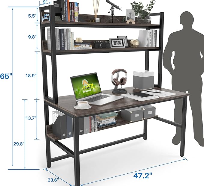 Aquzee Desk with Hutch Bookshelves, Computer Desk with 3 Tiers Storage Shelves, Space Saving Design Black Metal Legs Desk with Grey Board, Easy Assemble