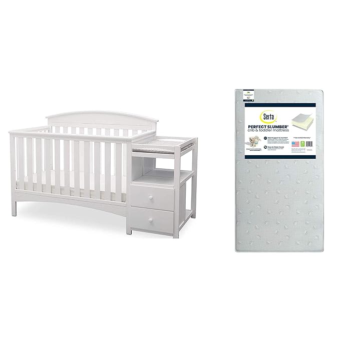 Delta Children Abby Convertible Crib 'N' Changer, Bianca + Serta Perfect Slumber Dual Sided Recycled Fiber Core Crib and Toddler Mattress (Bundle)