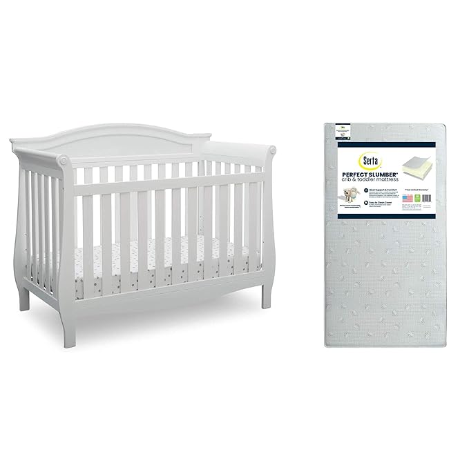 Delta Children Lancaster 4-in-1 Convertible Baby Crib, Bianca White + Serta Perfect Slumber Dual Sided Recycled Fiber Core Crib and Toddler Mattress (Bundle)