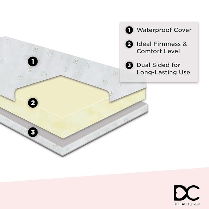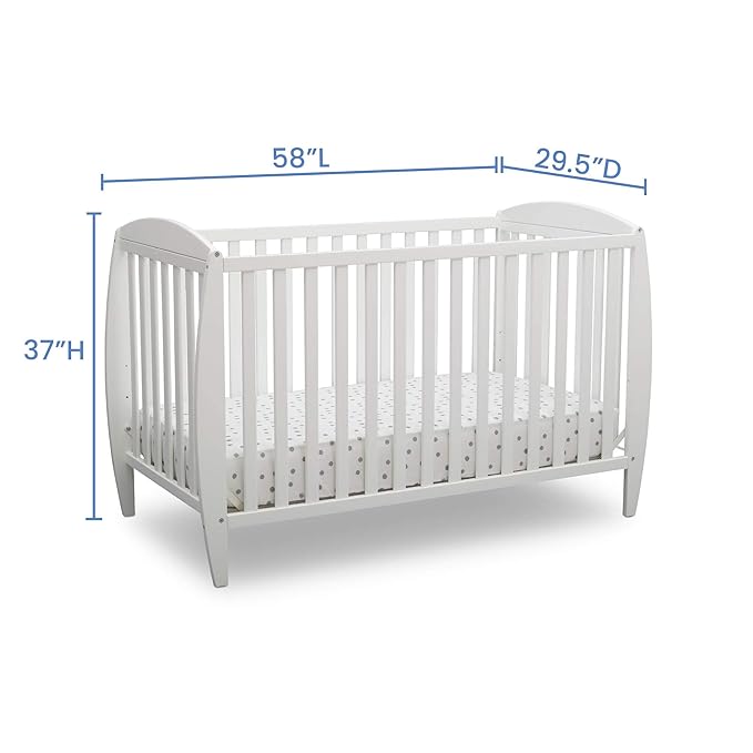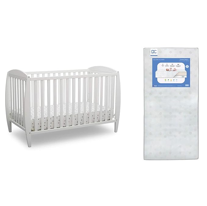 Delta Children Twinkle 4-in-1 Convertible Baby Crib, Sustainable New Zealand Wood, White and Delta Children Twinkle Galaxy Dual Sided Recycled Fiber Core Crib and Toddler Mattress (Bundle)