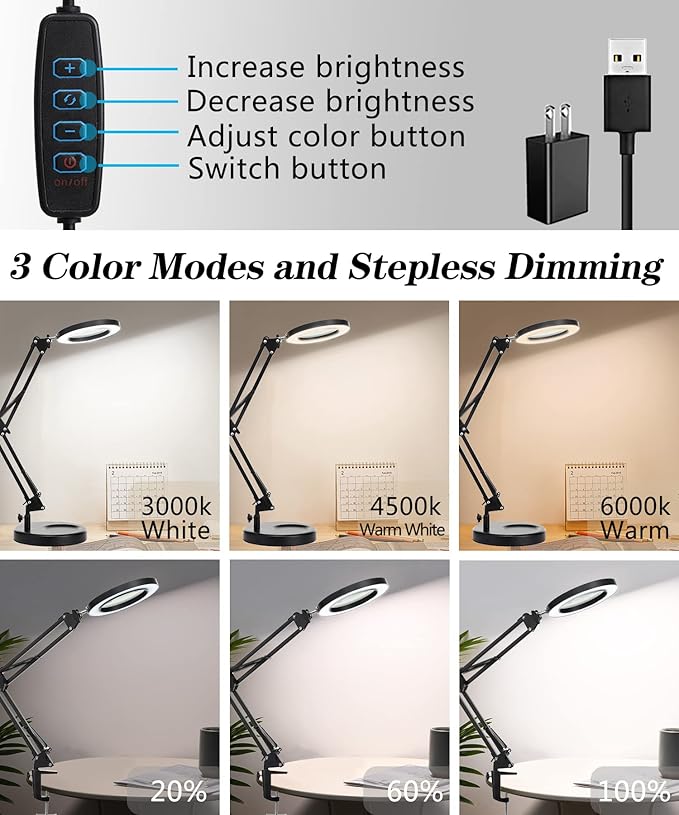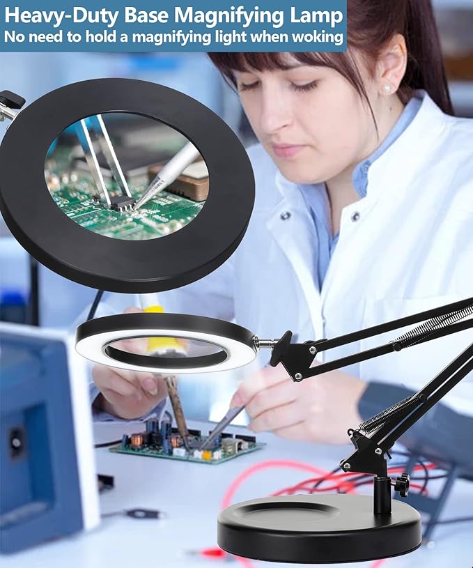 8X Desk Magnifying Glass with Light, NUEYiO 2-in-1 Heavy Duty Base&Clamp Magnifying lamp, 4.1'' Real Glass Len, 3 Color Stepless Dimmable LED Lighted Magnifier Glass for Soldering Crafts Sewing