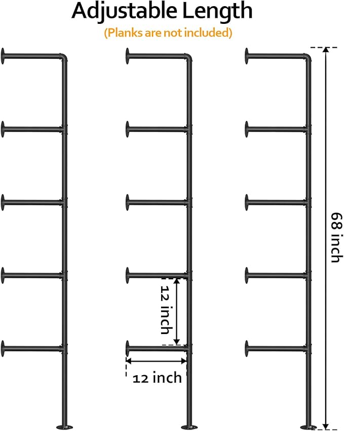 About This SIZE: Industrial iron pipe shelving is freely connected, Total Tall is 68 inches, 12 inches in between each...