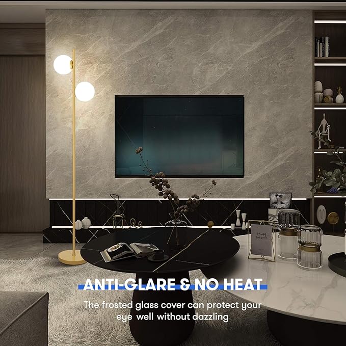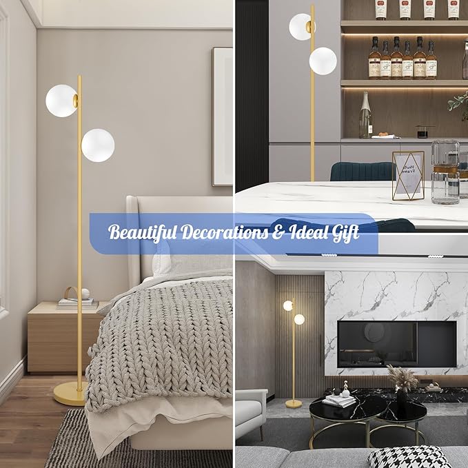 Mid Century Modern 2 Frosted Glass Globe Floor Lamp for Living Room,Contemporary LED Standing Light, Gold Corner Pole Office Bedroom, Study Room, Hotel, Antique Brass Lighting