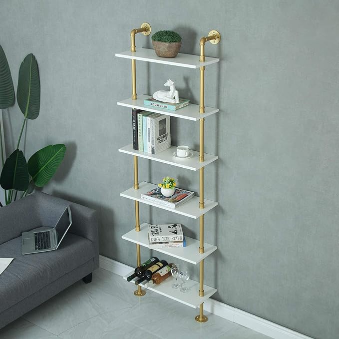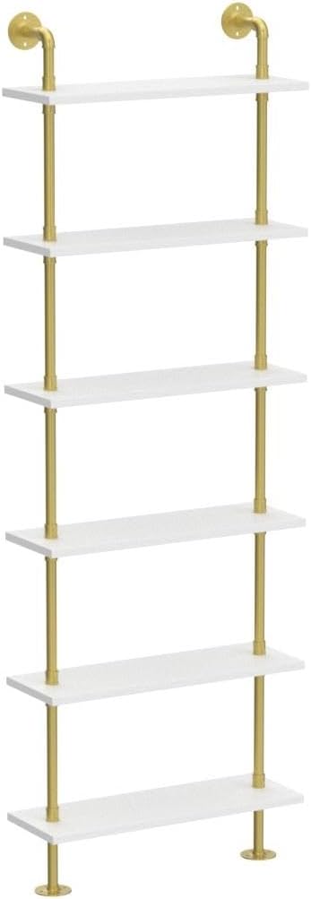 WGX Design For You Industrial 6-Tiers Modern Ladder Shelf Bookcase,Wood Storage Shelf,Display Shelving, Wall Mounted Wood Shelves(Gold)