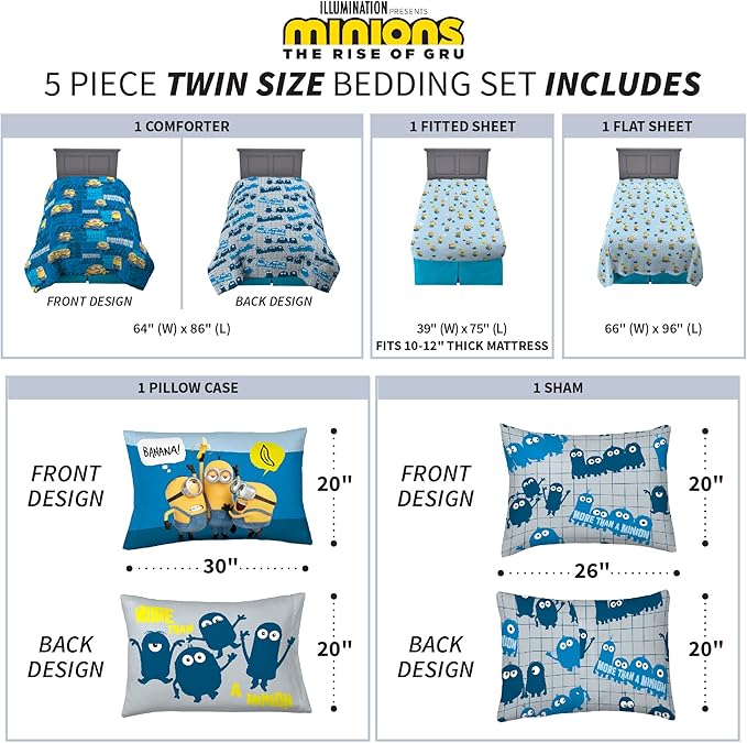 Franco Kids Bedding Super Soft Comforter and Sheet Set with Sham, 5 Piece Twin Size, Minions The Rise Of Gru