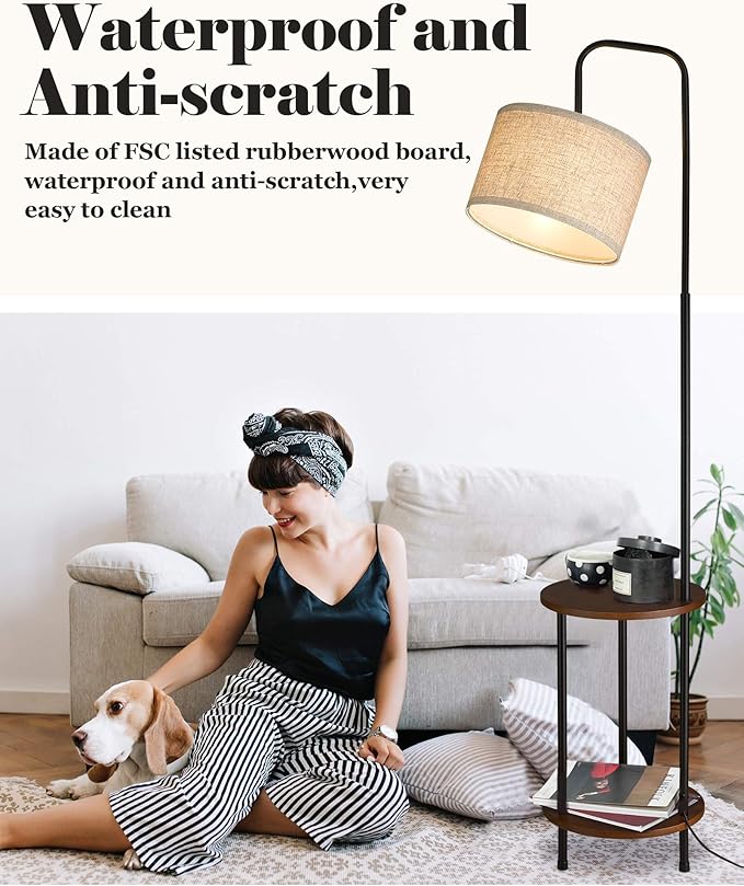ELYONA Modern Floor Lamp with End Table, Rubber Wood Bedside Table Lamp with Adjustable Drum Shade, Rustic Tall Pole Shelf Reading Standing Light for Farmhouse Bedroom, Living Room, Office - Walnut