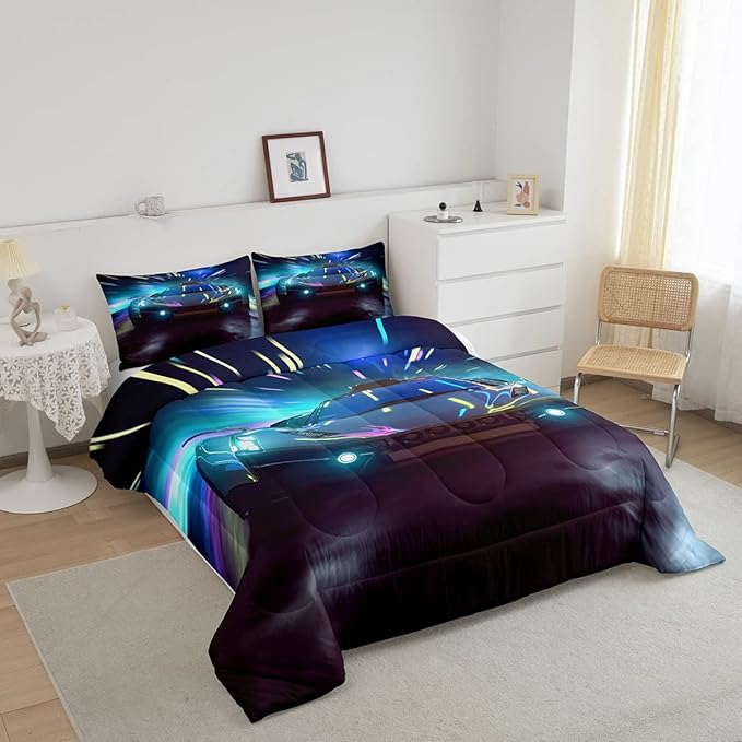 Boys Race Car Down Duvet, Cool Sports Car Comforter Set For Men Women, Extreme Sports Racer Bedding Set Full, Yellow Automobile Car Quilt Set, 1 Comforter Set With 2 Pillowcases, Lightweight, Blue