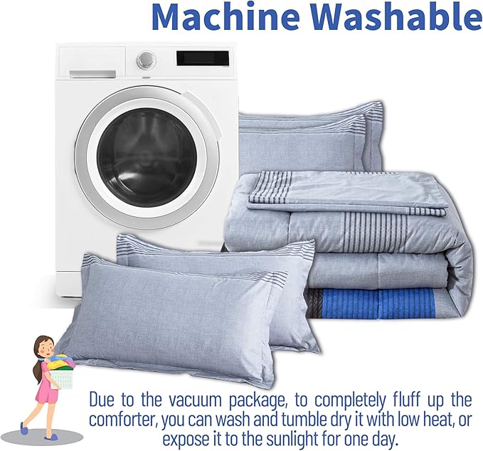 Andency Stripe Blue Comforter Set King Size, 3 Pieces Gray and Blue Patchwork Striped Comforter(104x90 Inch), Soft Microfiber Down Alternative Comforter Bedding Set with Corner Loops
