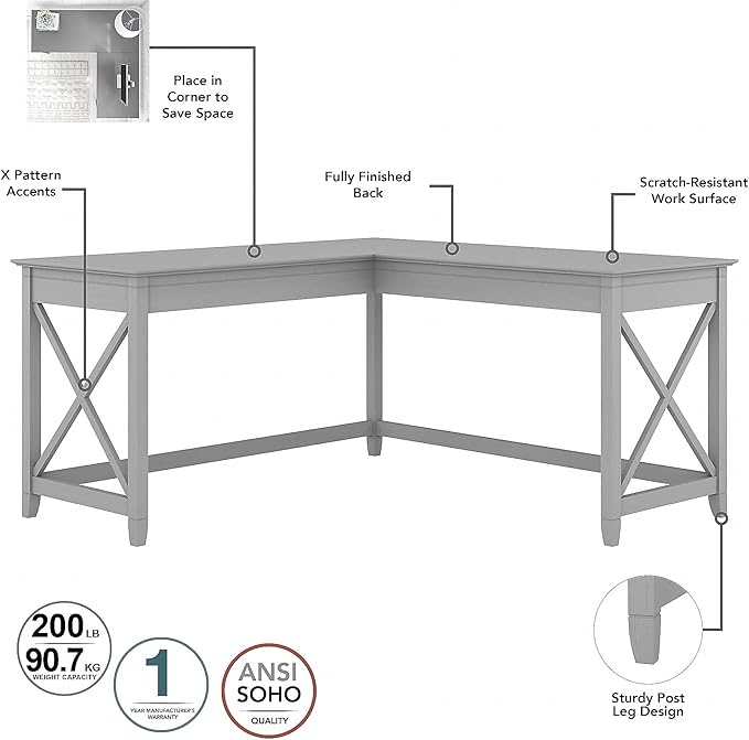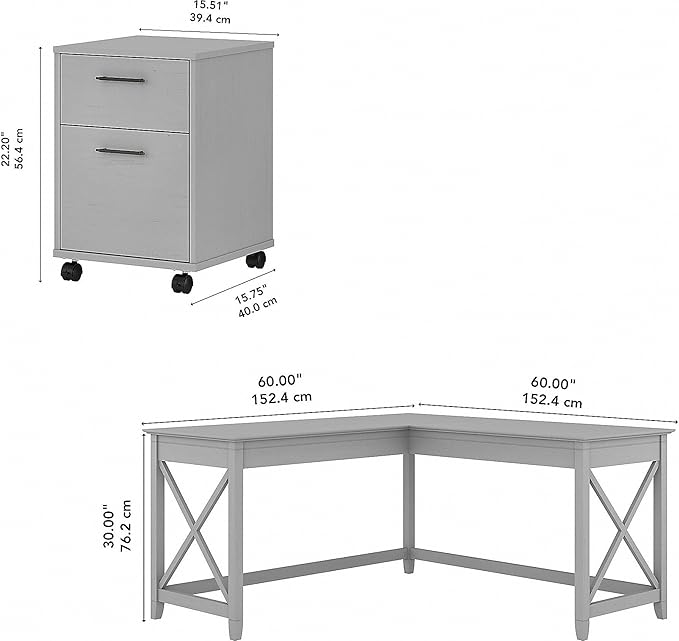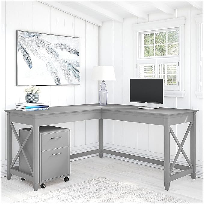 Bush Furniture Key West 60W L Shaped Desk with 2 Drawer Mobile File Cabinet in Cape Cod Gray