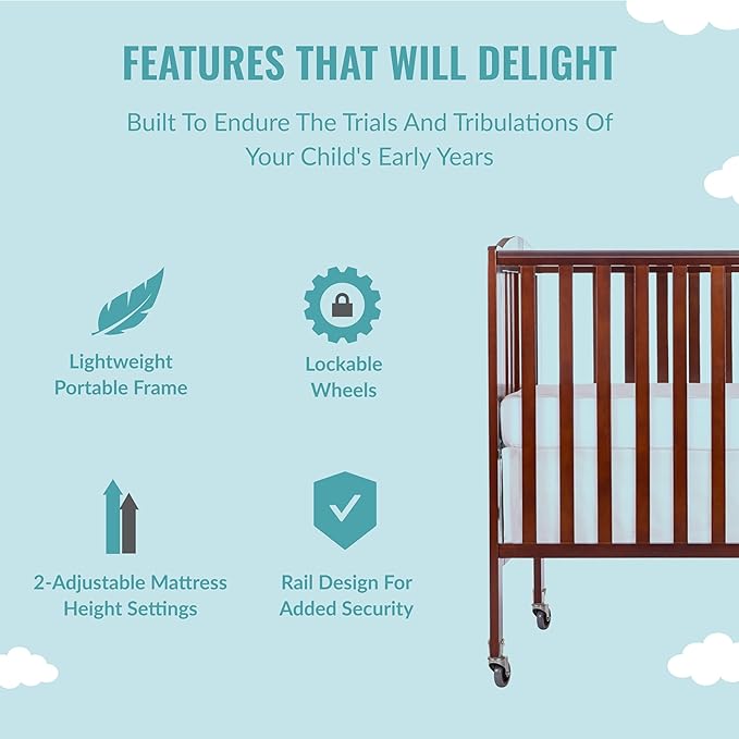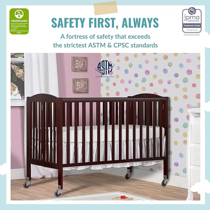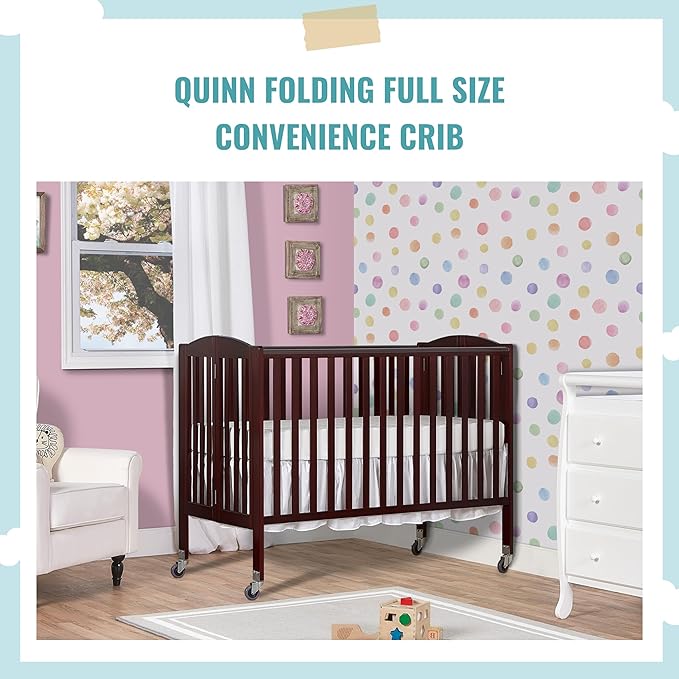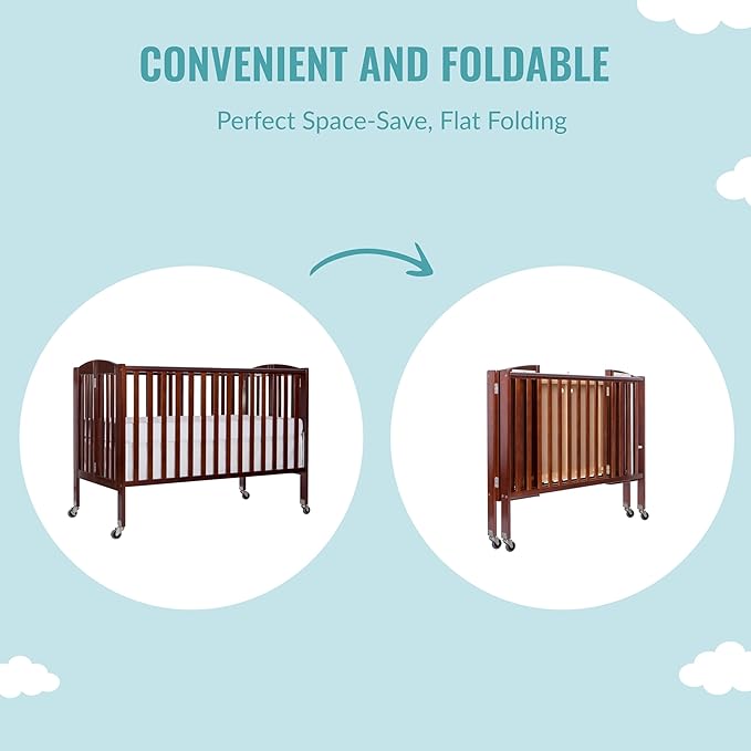Folding Full Size Convenience Crib In Espresso, Two Adjustable Mattress Height Positions, Comes With Heavy Duty Locking Wheels, Flat Folding Crib