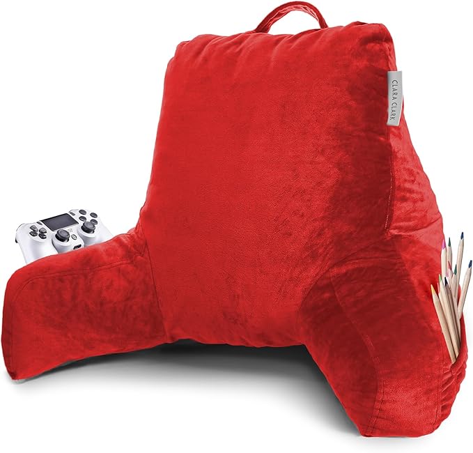 Clara Clark Reading Pillow, Standard Back Pillow for Sitting Up in Bed, Memory Foam Back Support Pillow, Reading Pillows for Sitting in Bed, Red Sit Up Pillow for Bed Chair Arm Pillow with Pockets