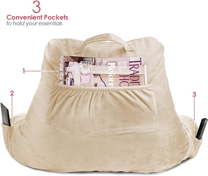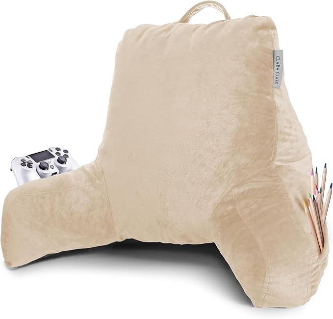 Clara Clark Reading Pillow, Standard Back Pillow for Sitting Up in Bed, Memory Foam Back Support Pillow, Reading Pillows for Sitting in Bed, Beige Cream Sit Up Pillow for Bed, Arm Pillow with Pockets