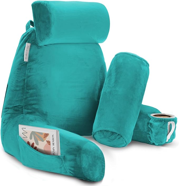 Clara Clark Reading Pillow, Large Back Pillow for Sitting Up in Bed, Memory Foam Back Support Pillow, Reading Pillows for Sitting in Bed Adult, Teal Sit Up Pillow for Bed Chair with Arms and Pockets