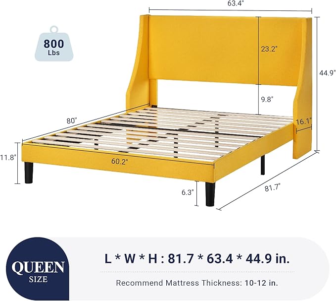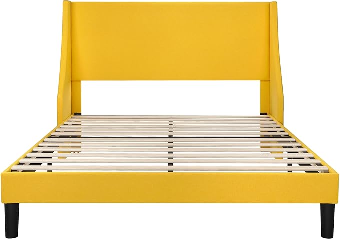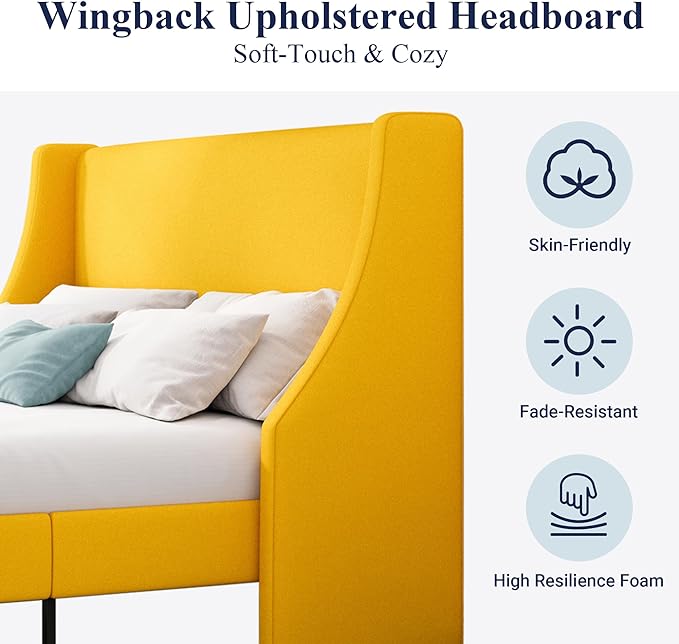 Allewie Queen Bed Frame, Platform Bed Frame Queen Size with Upholstered Headboard, Modern Deluxe Wingback, Wood Slat Support, Mattress Foundation, Light Yellow