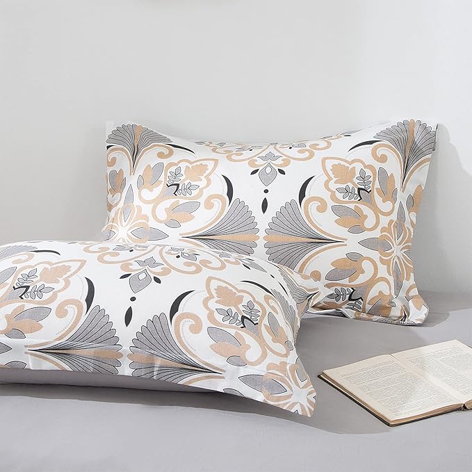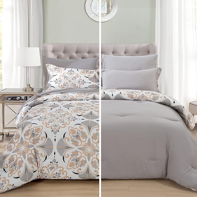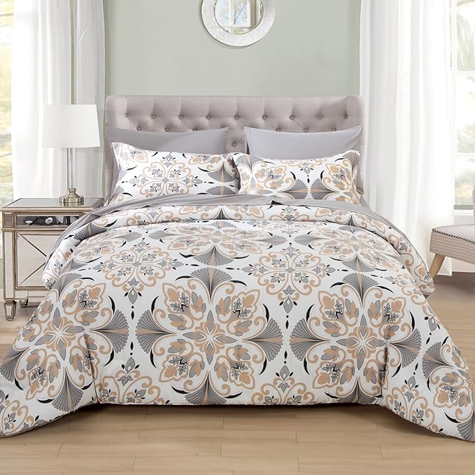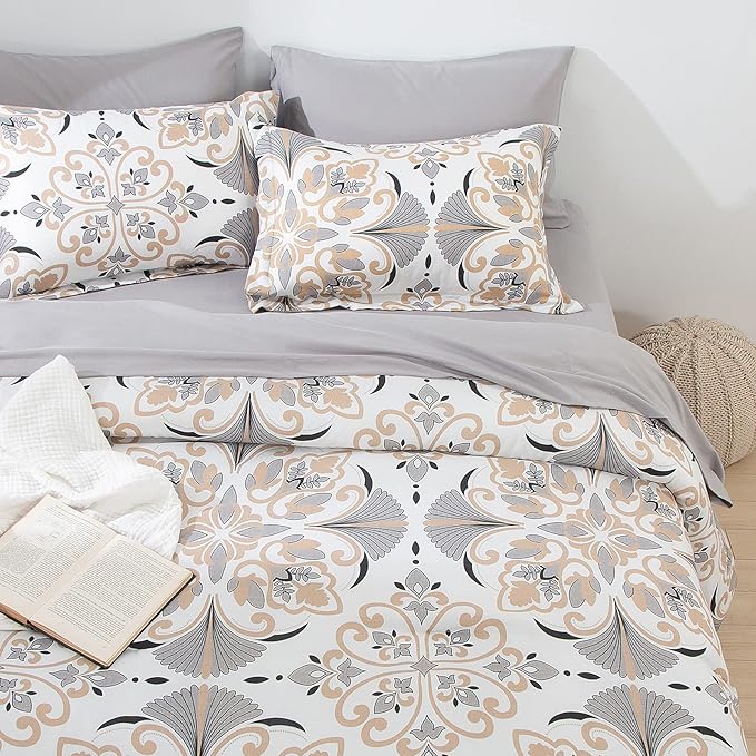 EMME Twin Comforter Set - Grey White Floral Bedding Set 5 PCS with Geometric Flowers Pattern, Soft Plant Printed Botanical Bed Set with Sheets,Fluffy Bed Bag for All Season(68"X90")