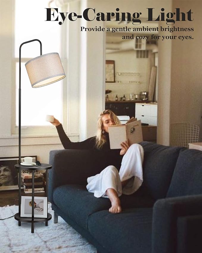 ELYONA Modern Floor Lamp for Living Room, Rubber Wood Side Table Lamp with Grey Fabric Drum Shade, End Table Tall Pole Standing Light for Bedroom, Office, Apartment, LED Bulb Included, Matte Black