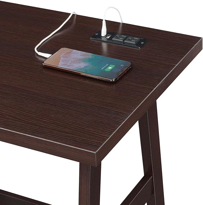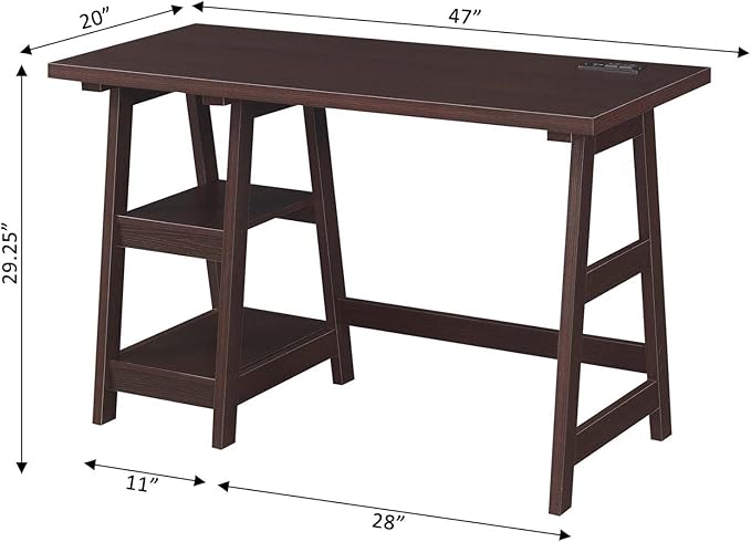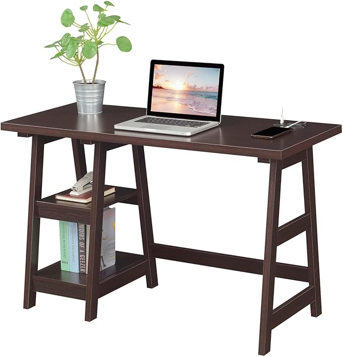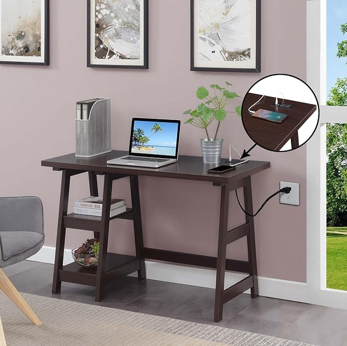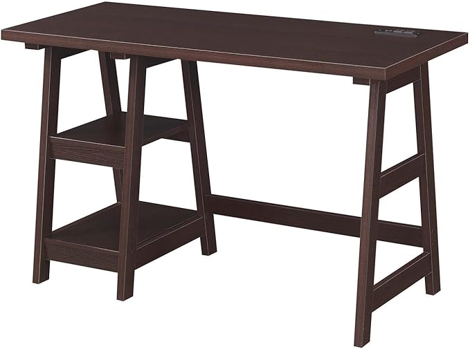 Convenience Concepts Designs2Go Trestle Desk with Charging Station and Shelves, Espresso