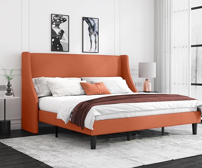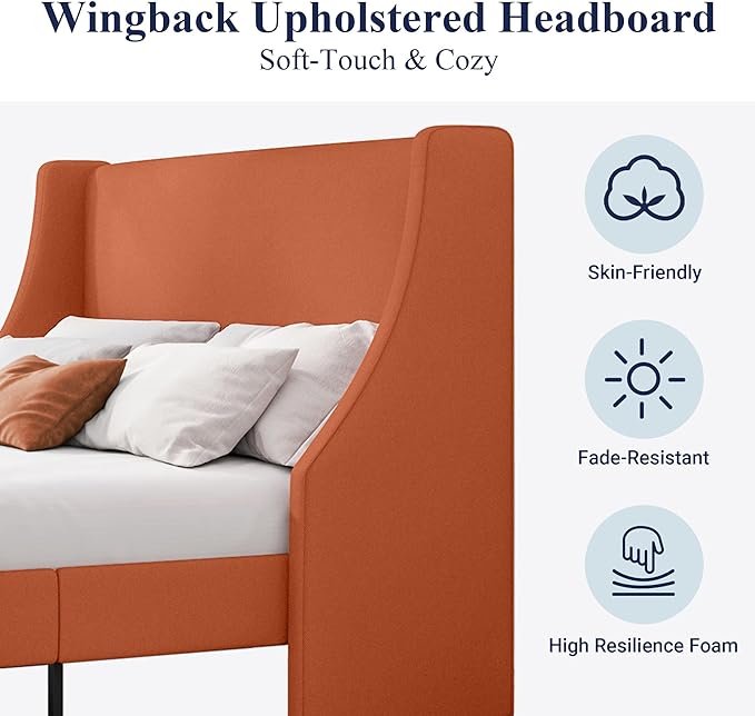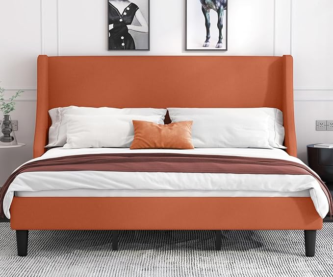 Allewie King Size Bed Frame, Platform Bed Frame with Upholstered Headboard, Modern Deluxe Wingback, Wood Slat Support, Mattress Foundation, Burnt Orange