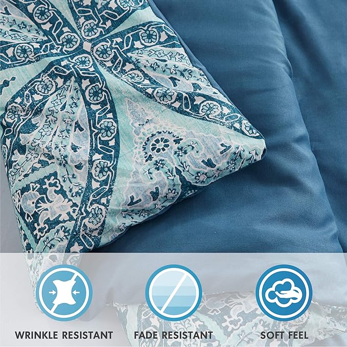 Comfort Spaces Bed in A Bag - Trendy Casual Design Cozy Comforter with Complete Sheet Set with Side Pocket, All Season Cover, Matching Shams, King(104"x90"), Gloria, Damask Blue 9 Piece