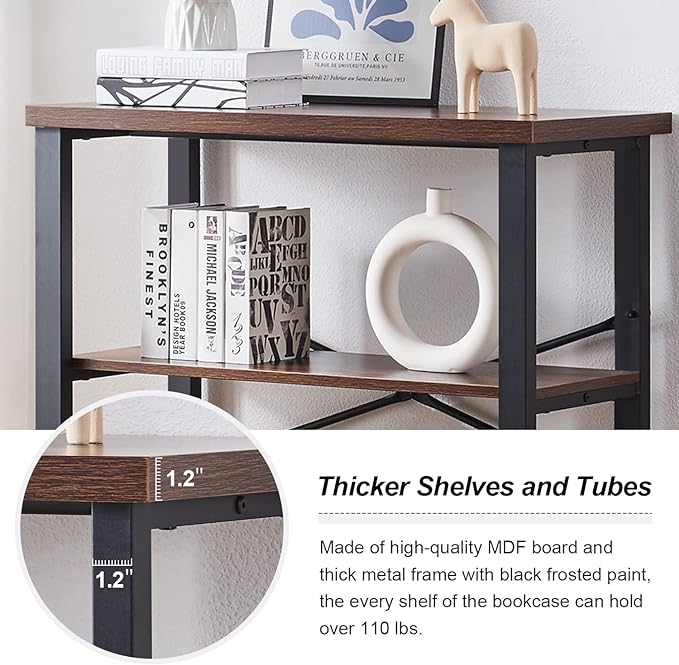 HOMBAZAAR Bookshelf, 3-Tier Vintage Industrial Book Shelf, Rustic Wood and Metal Bookcase and Bookshelves, Free Standing Storage Small Bookshelf for Living Room, Bedroom and Kitchen, Brown