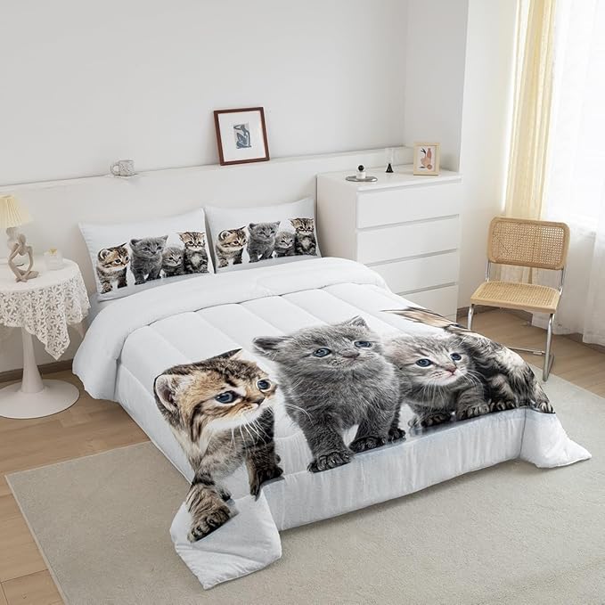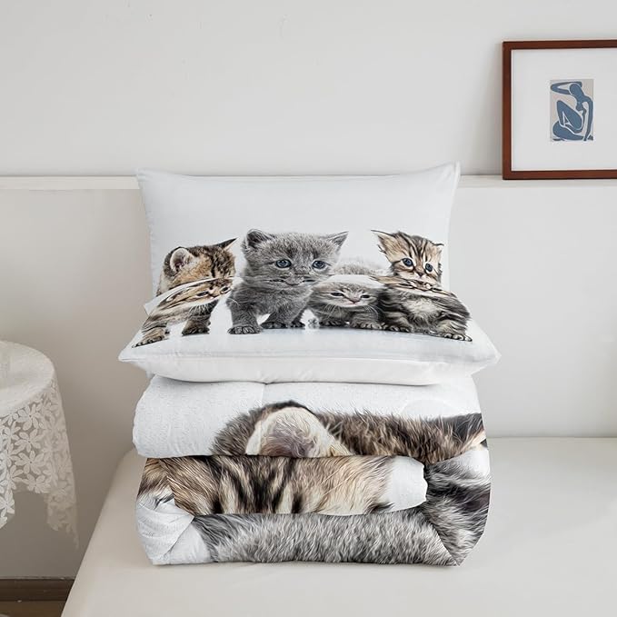 Little Cat Bedding Set Lovely Pet Cats Comforter Cat Lover's Animal Themed Design Comforter Set for Boys Girls Kids Room Decor Cute Kitten Print Duvet Set Twin Size with 1 Pillow Case