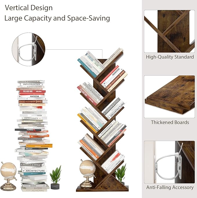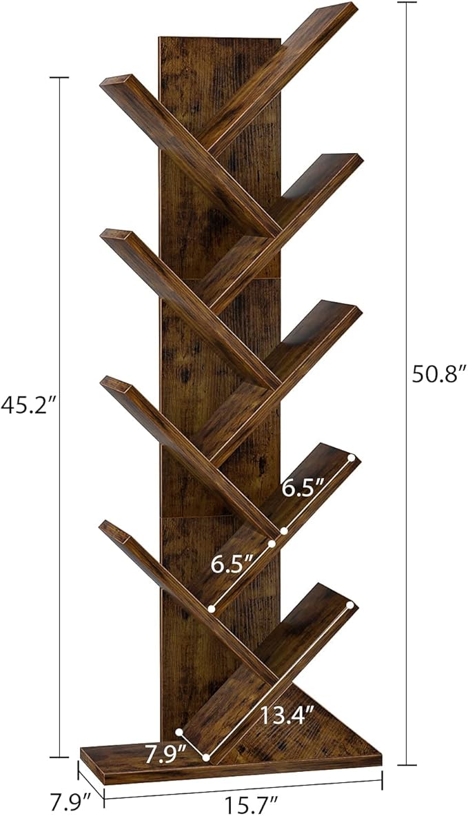 Topfurny Tree Bookshelf, 9-Tier Shelf Rustic Brown Bookcase, Retro Wood Storage Rack for CDs/Movies/Books, Anti-Fall Utility Organizer Shelves for Living Room, Bedroom, Home Office, Rustic
