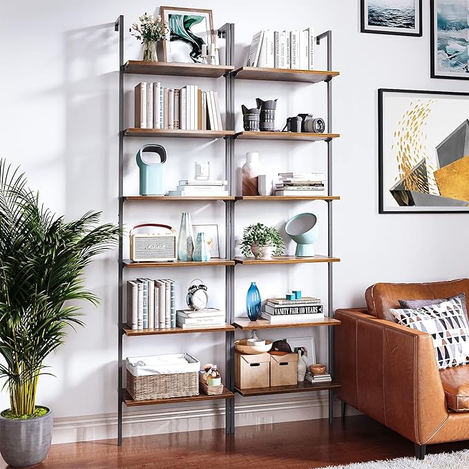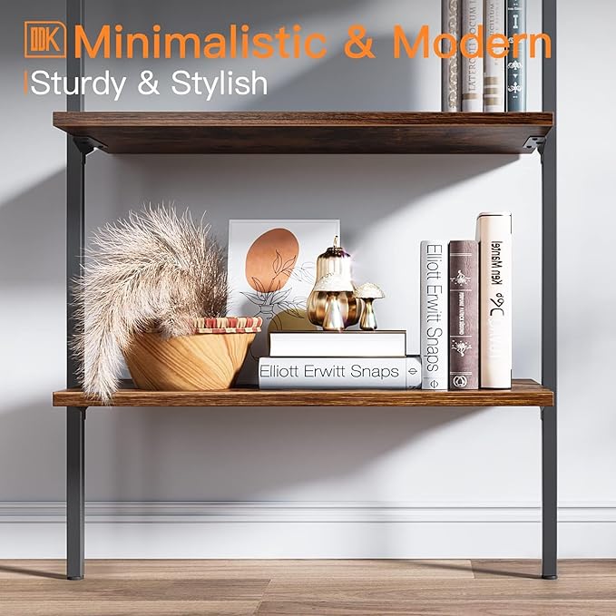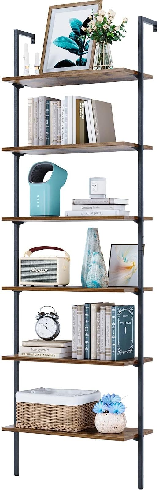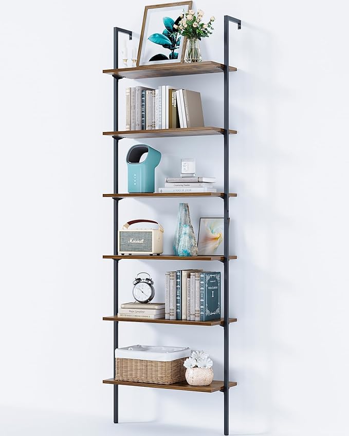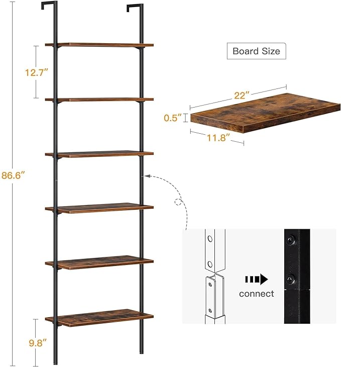 ODK 6-Tier Ladder Shelf, 87 Inches Wall Mounted Ladder Bookshelf with Metal Frame, Open Industrial Shelves for Home Office, Bedroom and Living Room, Rustic Brown