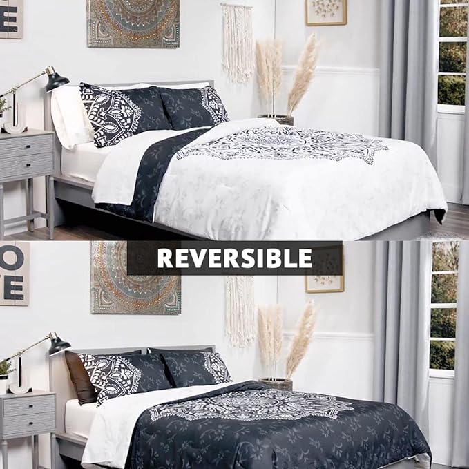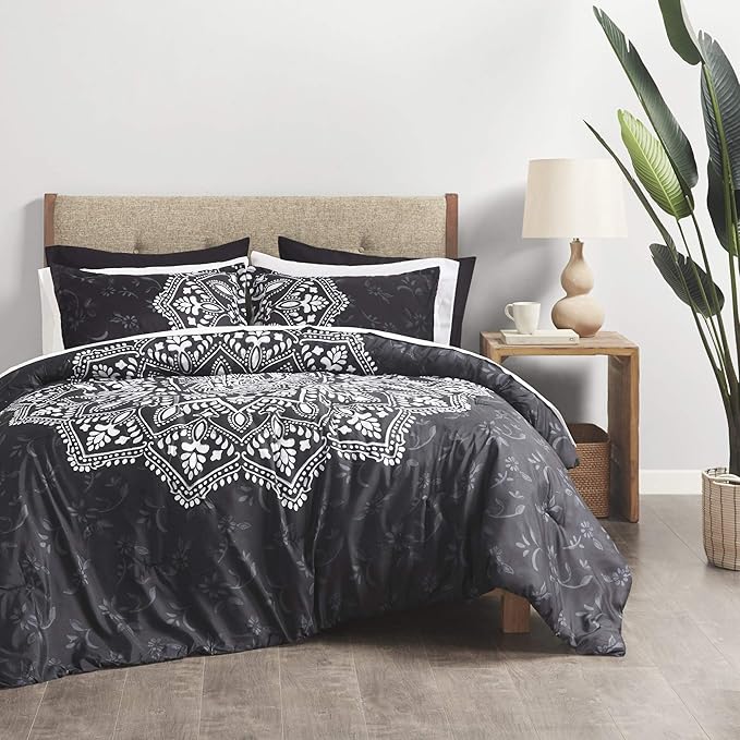 Comfort Spaces Bed in A Bag - Trendy Casual Design Cozy Comforter with Complete Sheet Set with Side Pocket, All Season Cover, Matching Shams, King(104"x90"), Ava Medallion Black 9 Piece