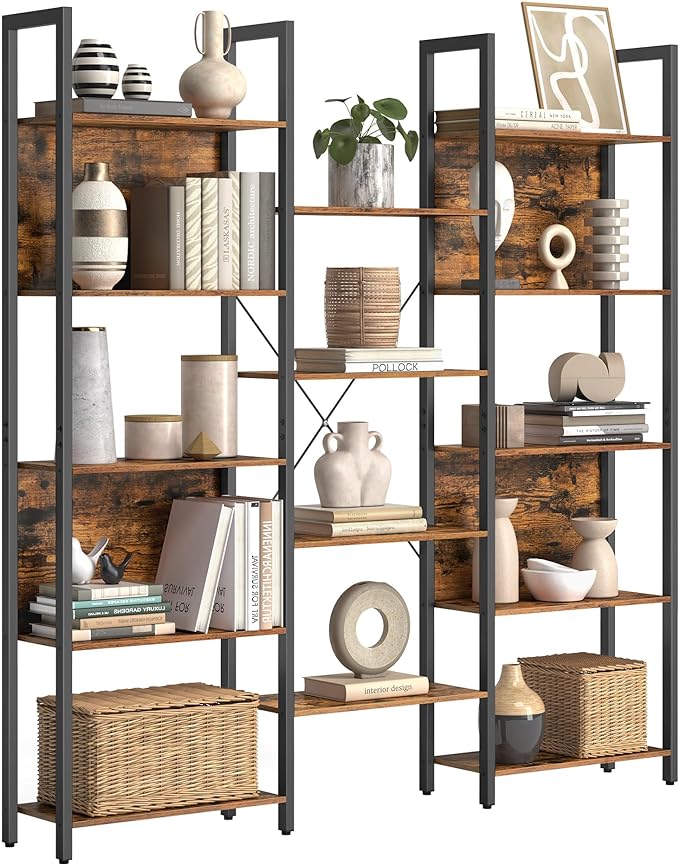 VASAGLE 5-Tier Bookcase with 14 Shelves, Book Shelf with Metal Frame, Bookshelf for Living Room, Home Office, Industrial Style, 9.4 x 62.2 x 65.4 Inches, Rustic Brown and Black ULLS107B01