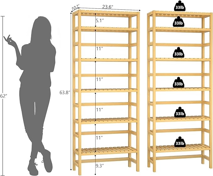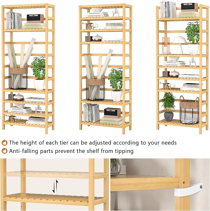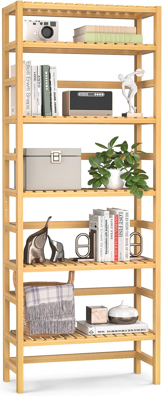Homykic Bookshelf, 6-Tier Bamboo Adjustable 63.4” Tall Bookcase Book Shelf Organizer, Free Standing Storage Shelving Unit for Living Room, Kitchen, Bedroom, Bathroom, Office, Rust Resistance, Natural