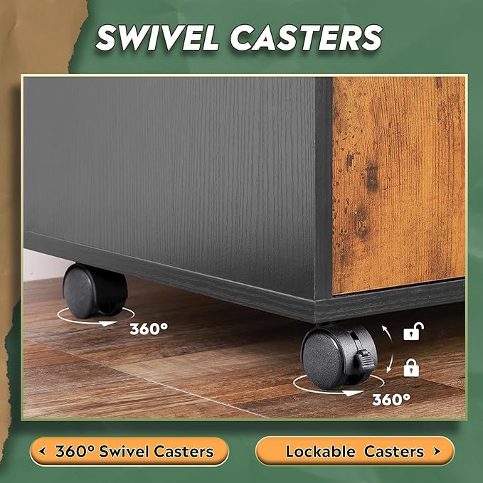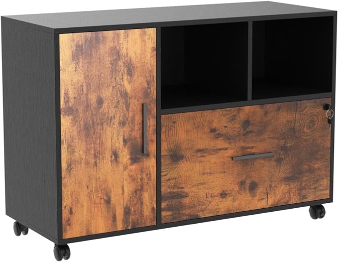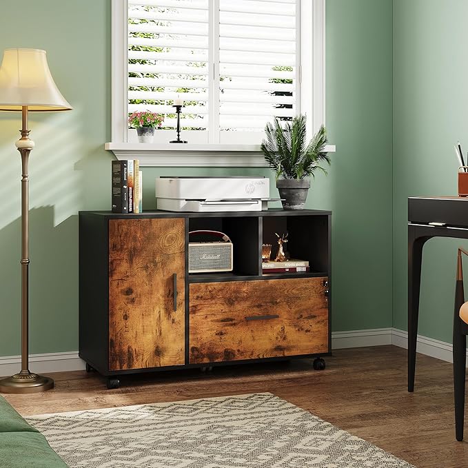 DEVAISE Lateral File Cabinet with Lock, 1-Drawer Rolling File Cabinets on Wheels for Home Office, Wood Printer Stand with Open Storage Shelf, Rustic Brown