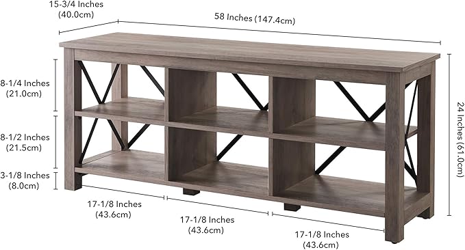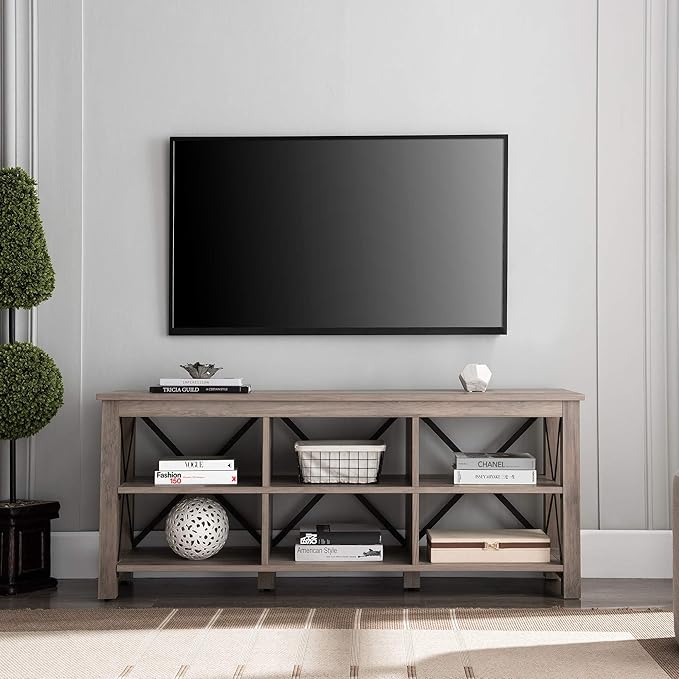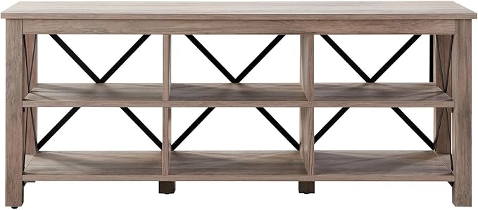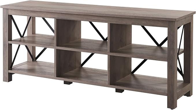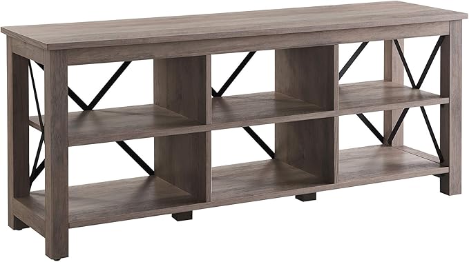 About This Accommodates TVs up to 65". Finished in gray oak with black metal accents. The top has a weight...