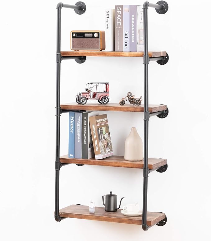 Industrial Wall Mounted Pipe Shelving,Rustic Metal Floating Shelves,Steampunk Real Wood Bookcases,DIY Bookshelf Hanging Shelves,Farmhouse Kitchen Bar Office Home Storage (5-Tier with 4 Boards,24in)