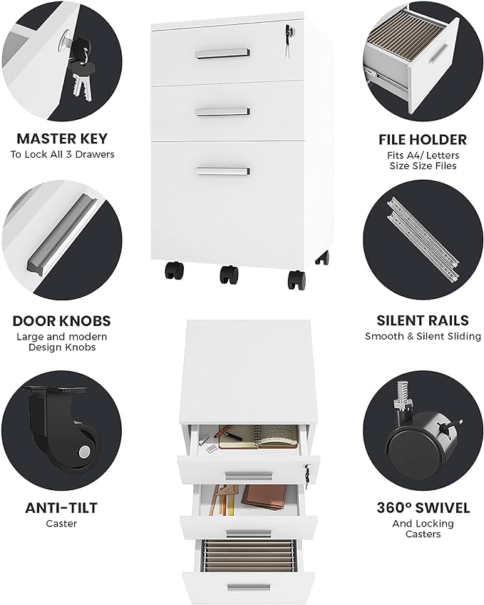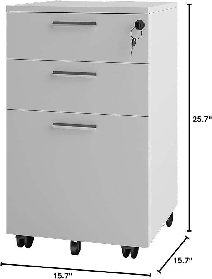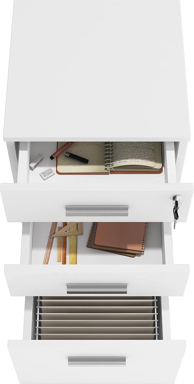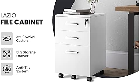 Lazio 26 Inch File Cabinet with Lock - Filing Cabinet for Home and Office - 3 Drawer File Cabinet with Wheels for A4 Sized Letters/Documents, Legal Sized Documents, Hanging File Folders - White/White