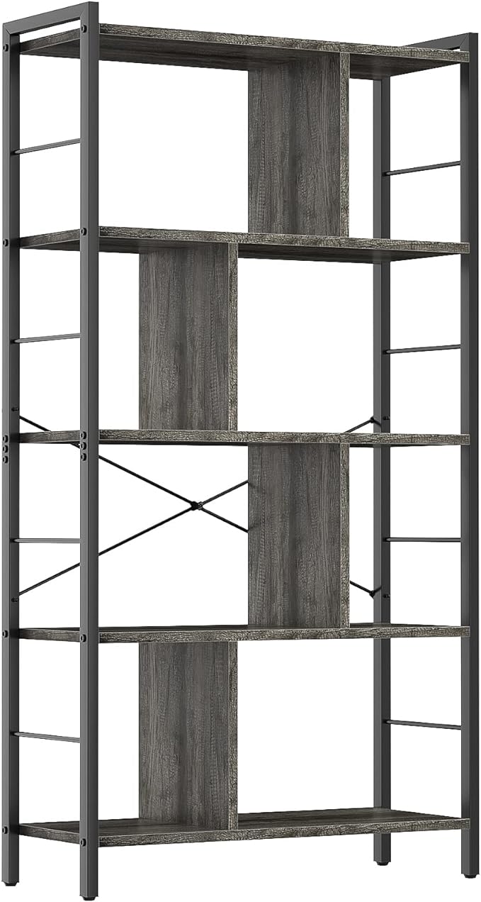 armocity Bookshelf, 5 Tier Tall Modern Bookcase Wood Metal Frame Standing Book Shelf, Display Bookshelves Storage Organizer for Bedroom Living Room Home Office, Grey