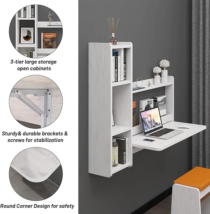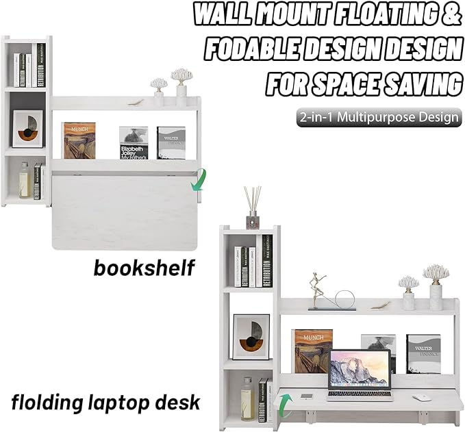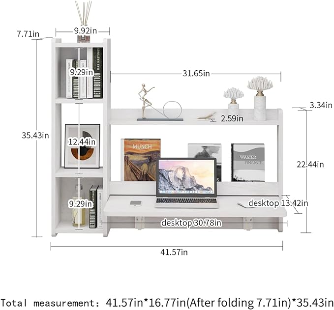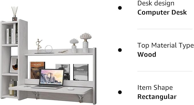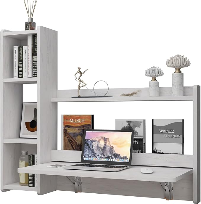 Pmnianhua Floating Desk,41'' Wall Mounted Desk Fold Down Laptop Desk Folding Space Saving Table Workstation with Storage Shelves for Bedroom Study Room Small Space (Off White-Left)