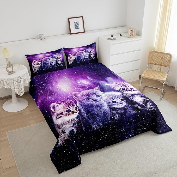 Cat Comforter Cute Pet Cats Pattern Bedding Set Outer Space Kawaii Kitten Comforter Set for Children Kids Boys Girls 3D Animal Theme Galaxy Duvet Set Room Decor Quilt Set Full Size