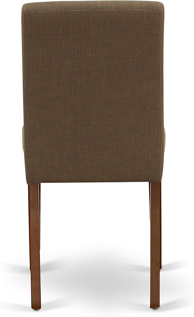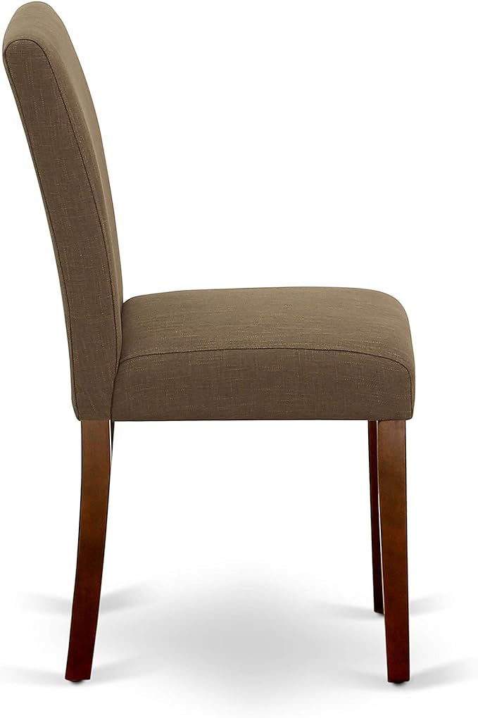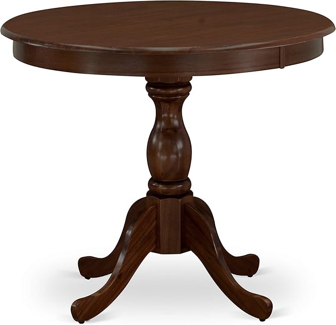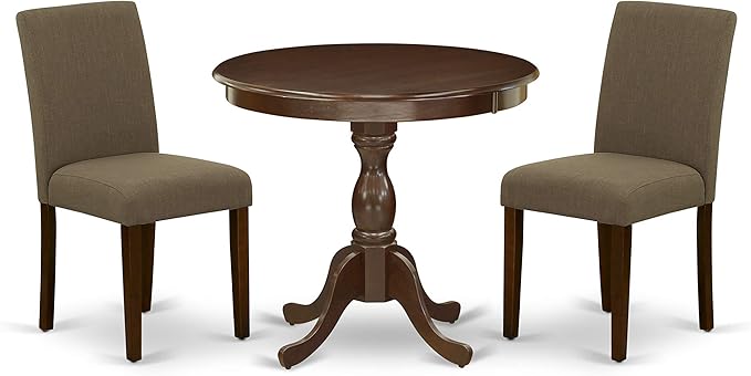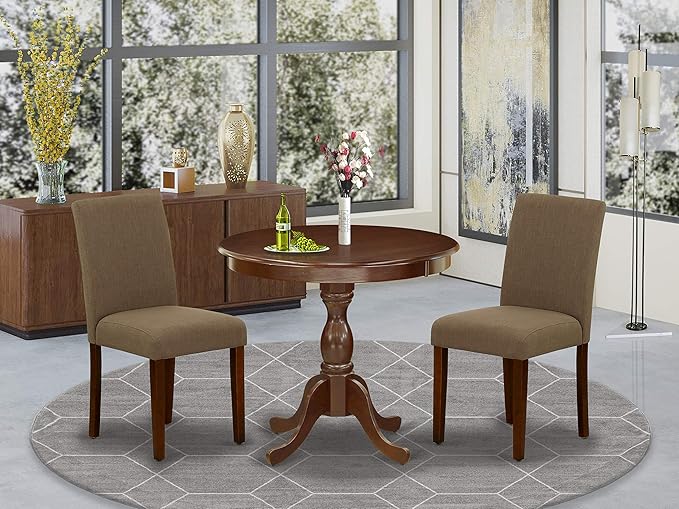 East West Furniture AMAB3-MAH-18 Antique 3 Piece Kitchen Set for Small Spaces Contains a Round Dining Table with Pedestal and 2 Coffee Linen Fabric Upholstered Chairs, 36x36 Inch