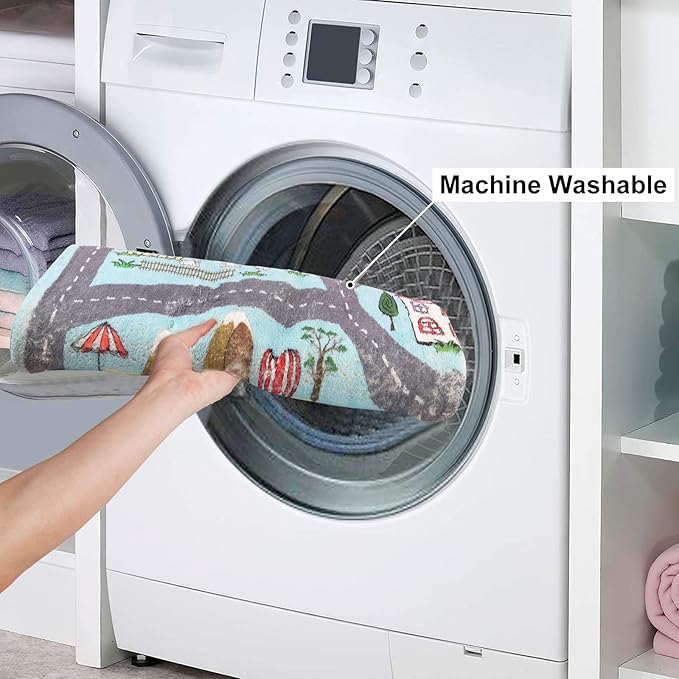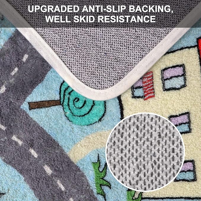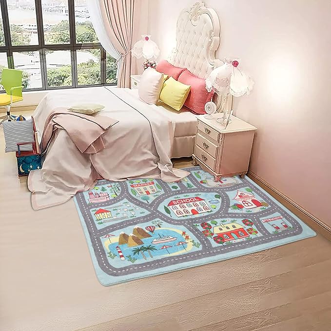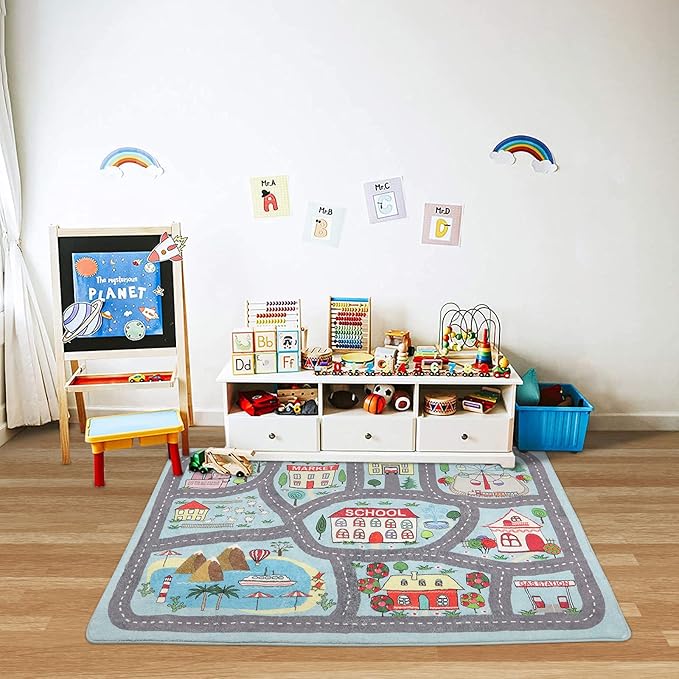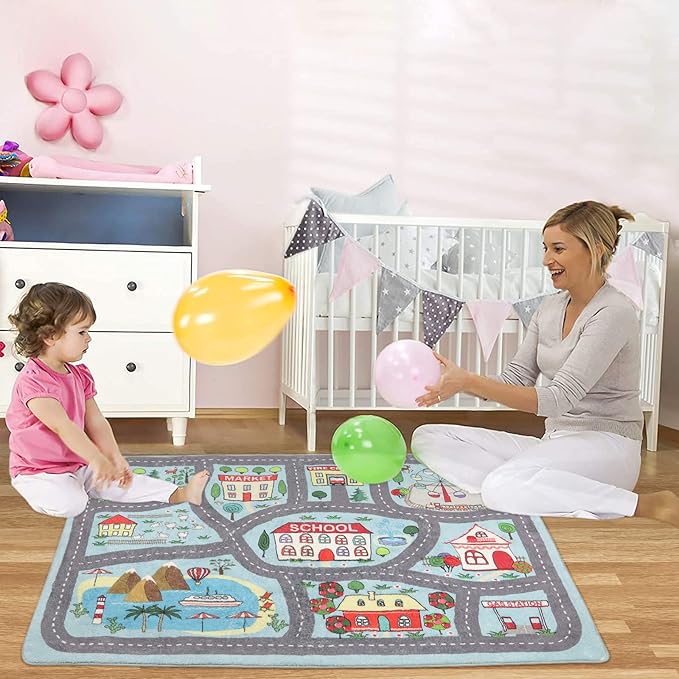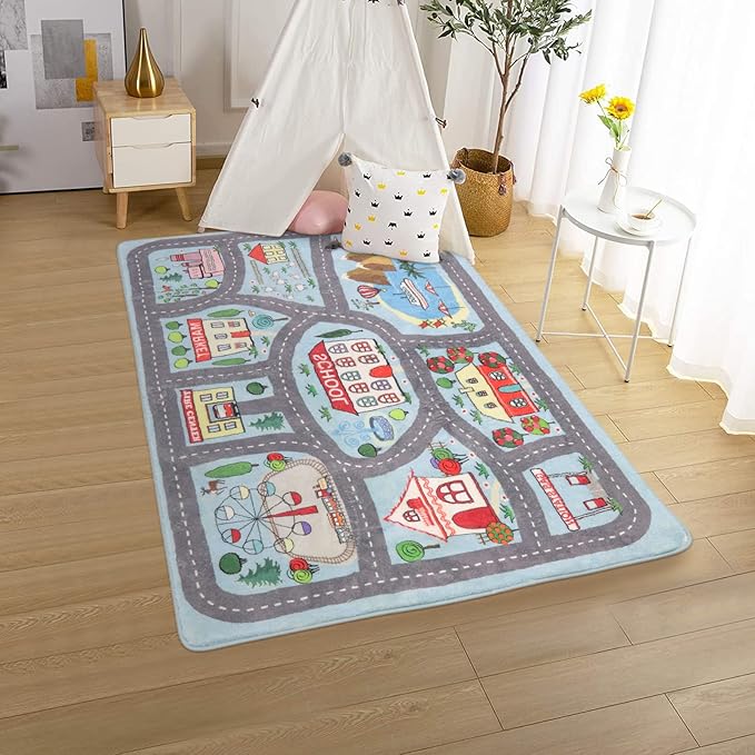 Non-slip Kids Playmat Rug for Playroom, 3'x 5' Blue Washable Children's Educational Rugs, Learning & Have Fun Safely City Life Road Traffic Play Mat Carpet for Baby Room Bedroom