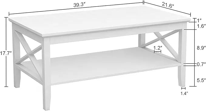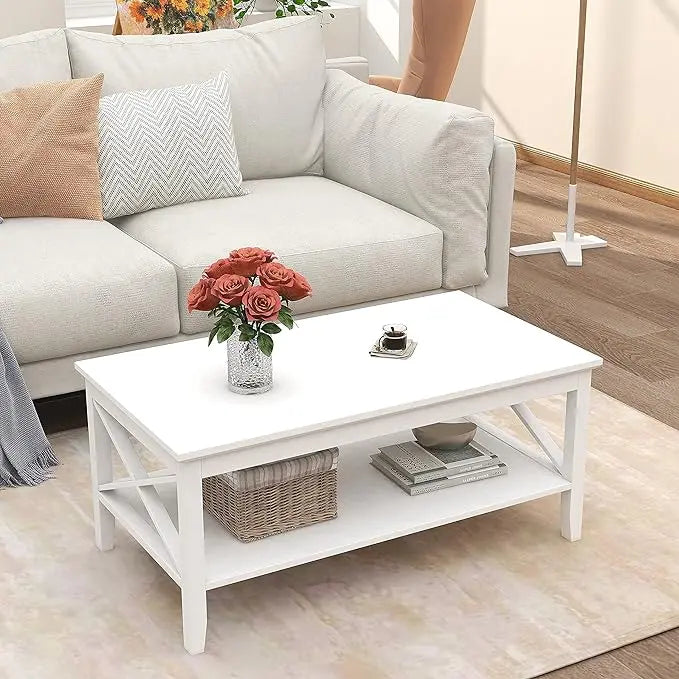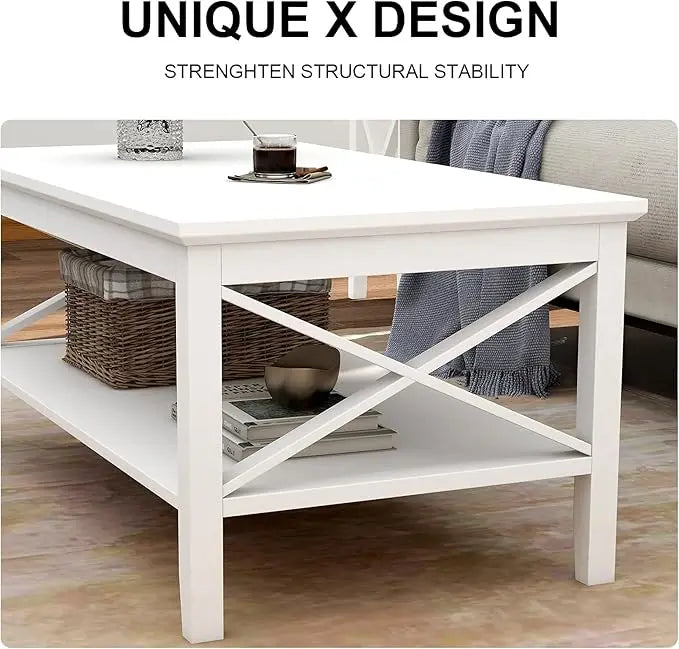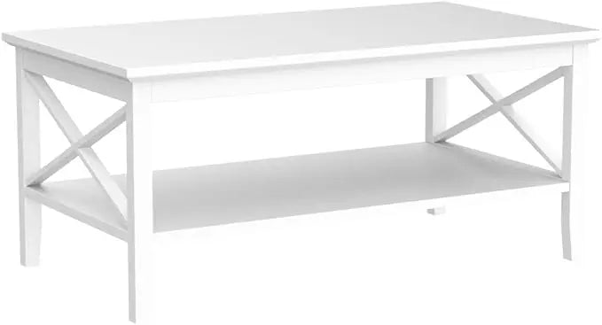 ChooChoo White Coffee Table Classic X Design for Living Room, Rectangular Modern Cocktail Table with Storage Shelf, 39 Inch