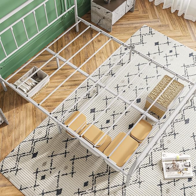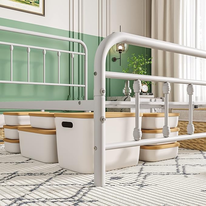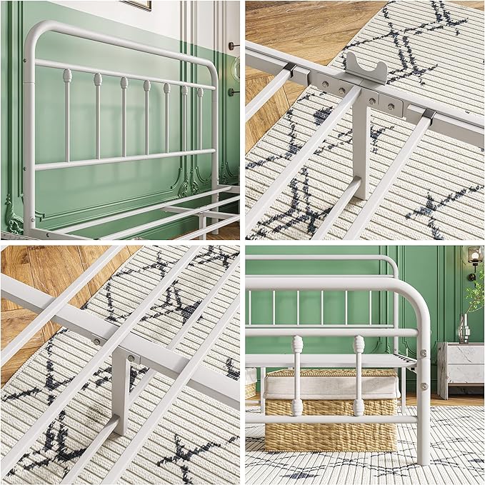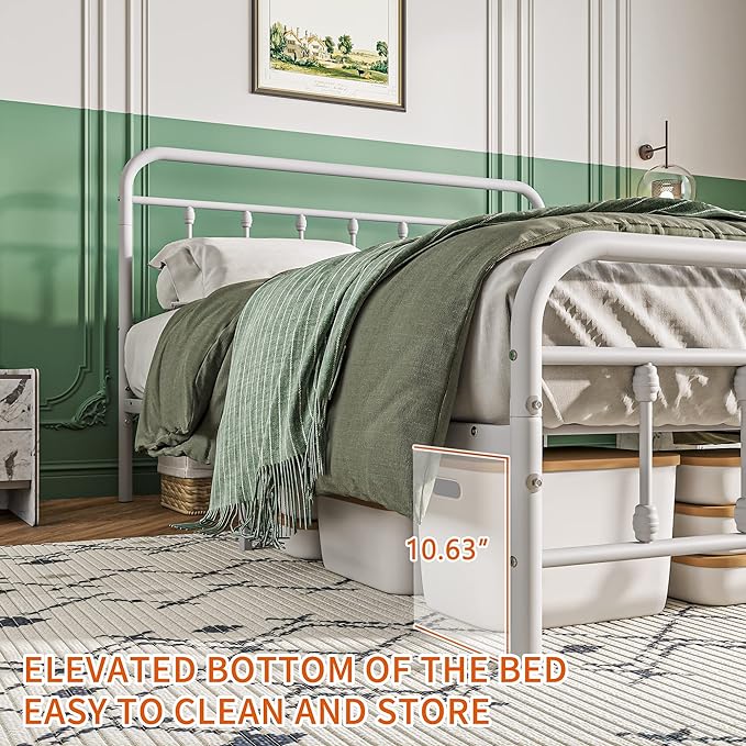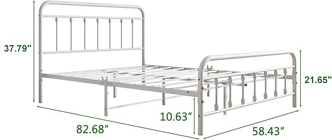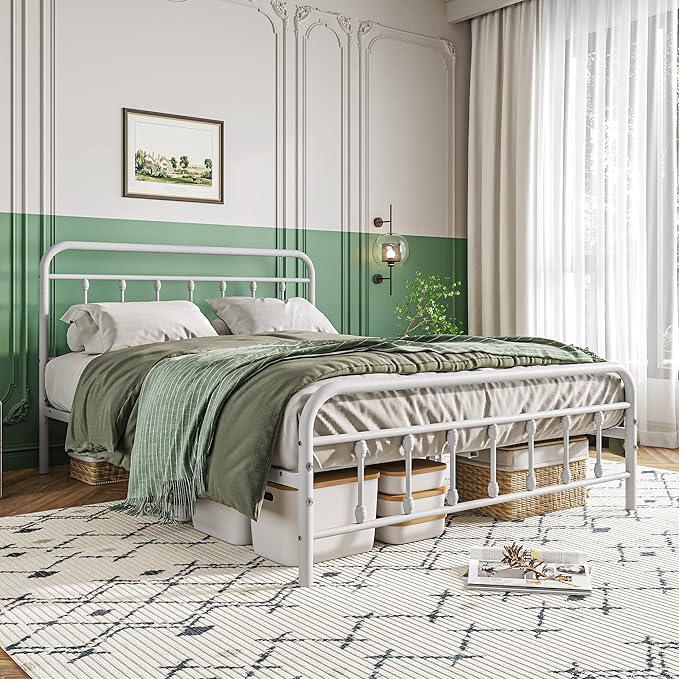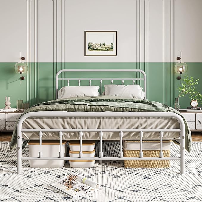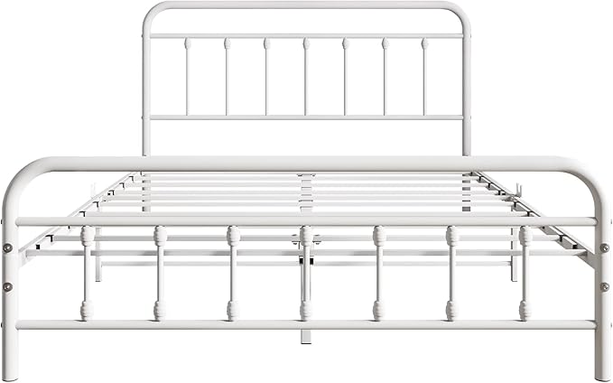 Vintage Queen Size Bed Frame with Headboard and Footboard Mattress Heavy Duty Metal Platform Bed Frame Steel Slat Support (Queen, White)
