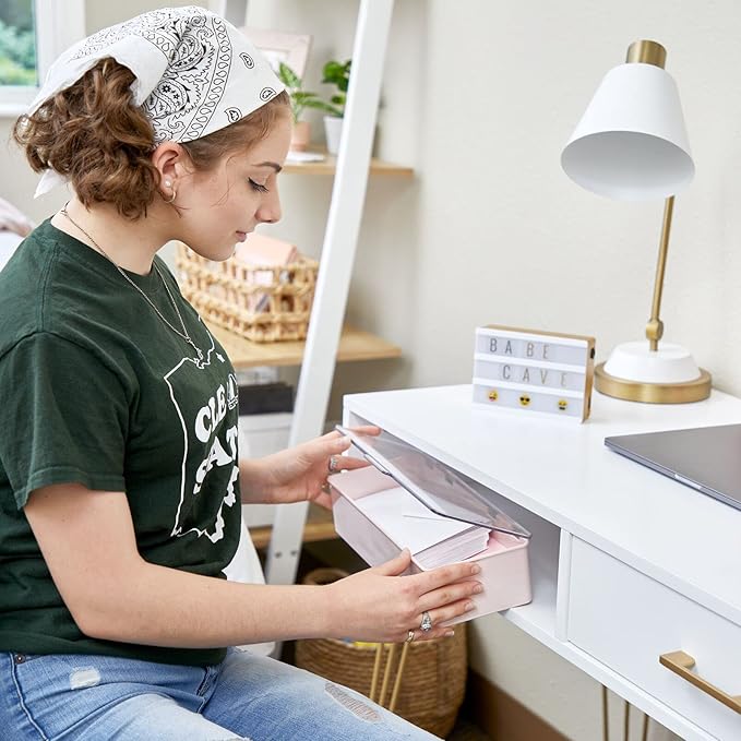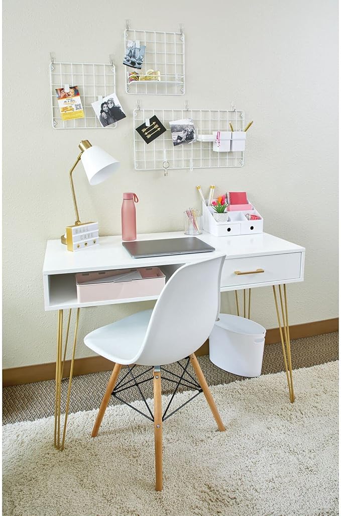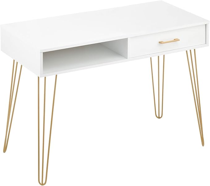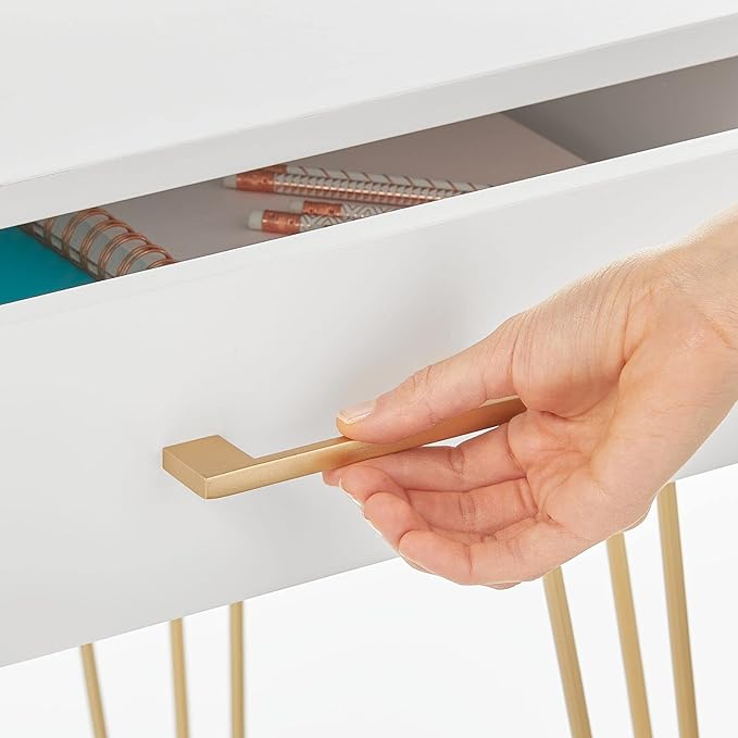 mDesign Metal/Wood Modern Computer Desk - Minimalist Desk and Computer Table with Drawer - Simple Desk with Storage Cubby and Hairpin Legs - Small Work Desk for Home Office, Study - White/Soft Brass