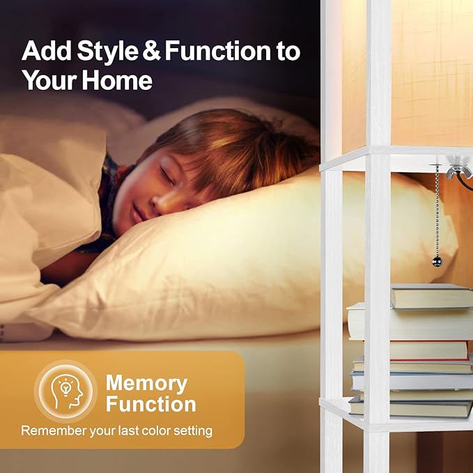 OUTON Floor Lamp with Shelves, LED Modern Shelf Floor Lamp with 2 USB Ports & Power Outlet, 3 Color Temperature, Storage Display Wood Column Standing Tall Lamp for Living Room, Bedroom, Office (White)