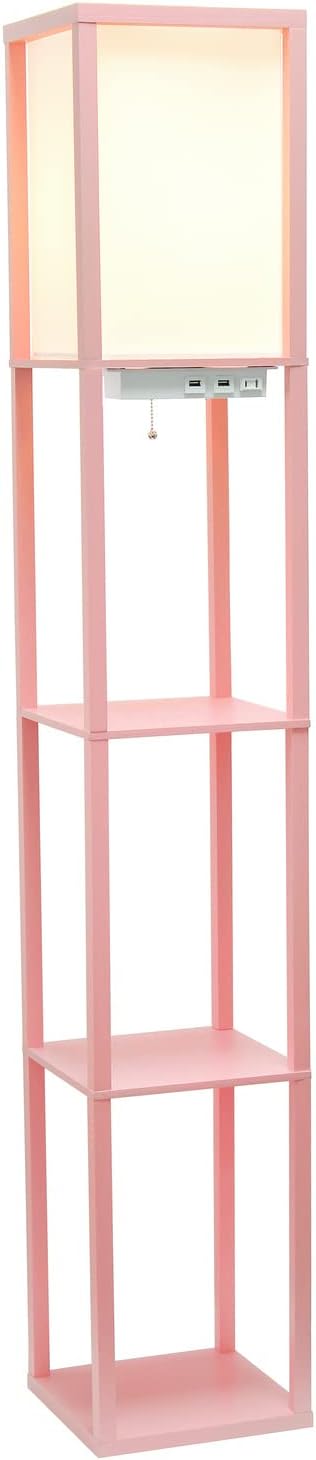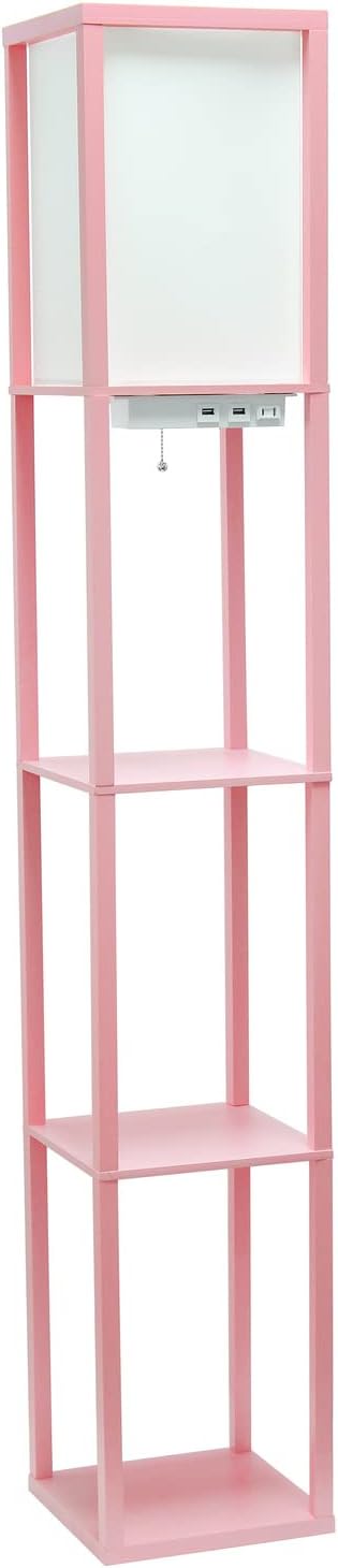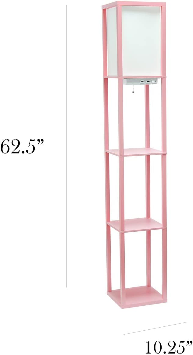 Simple Designs LF1037-LPK Floor Lamp Etagere Organizer Storage Shelf with 2 USB Charging Ports, 1 Charging Outlet and Linen Shade, Light Pink