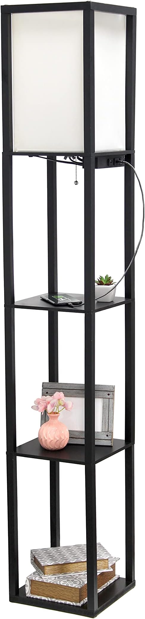 About This Floor lamp with 3 shelves for storage/display Pull-chain on/off switch Linen shade casts soft, warm glow 2 USB...